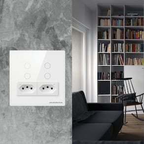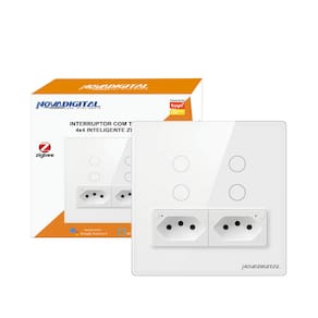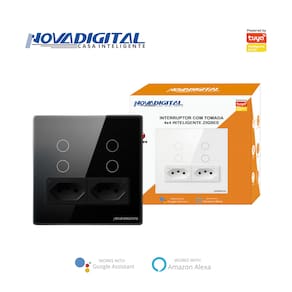 Descrição Novo modelo do interruptor com tomada zigbee, agora no padrão 4x4 e com duas tomadas! Total controle via aplicativo ou por comando de voz.