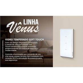 Inteligente Vênus Wifi 3 Botões Ekaza Branco 4x2 Inteligente Vênus Wi-fi 3 Botões Branco Ekaza Controle seu ambiente com praticidade e sofisticação O Inteligente Vênus Wi-fi 3 Botões Ekaza proporciona um controle inteligente e moderno para a iluminação de sua casa. Com a tecnologia Wi-fi, você pode acionar as luzes através do toque suave em seus três botões. Além disso, a compatibilidade com assistentes virtuais como Google Assistente e Amazon Alexa garante ainda mais conveniência no dia a dia. Diferenciais: Design elegante com acabamento em vidro soft touch Conexão Wi-fi que permite controlar os ambientes remotamente Compatível com assistentes virtuais para maior facilidade de uso Funcionalidade de 3 botões para acionamento de múltiplas lâmpadas ou cenários de iluminação Mais sobre o Produto: Controle por aplicativo de smartphone Programação de horários para acendimento automático Integração com dispositivos de automação residencial Compatibilidade com caixinhas de 4x2 polegadas Dicas de uso: Instale o Inteligente Vênus em seu ambiente desejado Conecte o dispositivo à rede Wi-fi Baixe o aplicativo correspondente para configuração Associe o aos assistentes virtuais para comandos de voz Ficha Técnica: Marca: Ekaza Modelo: Vênus Conectividade: Wi-fi Botões: 3 Cor: Branco Compatibilidade: Google Assistente, Amazon Alexa Dimensões: 4x2 polegadas Aplicativos: JWCOM, Ekaza, Android, Tuya, Smart Life e NovaDigital. : 12 meses contra defeitos de fabricação da Ekaza. Observação: é importante ter uma rede Wi-Fi 2,4GHz com boa capacidade para gerenciar os dispositivos de forma eficaz. Instabilidades na conexão podem interferir na resposta aos comandos via aplicativo e assistentes de voz, e na execução de rotinas automáticas. Recomenda-se consultar um técnico da operadora para garantir uma conexão estável.