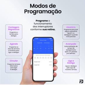 🔹 Automatize sua Rotina Programe horários para ligar/desligar luzes ou dispositivos conectados, mesmo fora de casa. Através do app Panda Plus, Tuya ou Smart Life, você pode controlar tudo remotamente com seu smartphone.