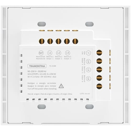 Interruptor Touch Smart 4x4 Tramontina Branco Com 6 Canais Interruptor Touch Smart 4x4 Tramontina Branco com 6 Canais O interruptor touch smart 4x4 Tramontina branco com 6 canais é a escolha perfeita para proporcionar uma iluminação inteligente e uma conexão completa para sua casa. Com ele, você tem o controle da iluminação da sua casa de diversos locais e na palma da sua mão, por comandos de voz via e Assistente ou através do aplicativo exclusivo Tramontina smart. Ele permite a programação de acordo com a sua localização, previsão do tempo e horários específicos. Seu design é sofisticado e moderno, e conta com painel de vidro na cor branca com botão touch retro iluminado com LEDs azuis, que também permite comandos com toque suave. Ele é bivolt e tem corrente máxima de 10 amperes, necessitando de fio neutro para a instalação e rede Wi-Fi de giga hertz. Ele também possui bluetooth para auxiliar na configuração no aplicativo e aceita comunicação por rádio frequência 433 hertz, para acionar com controles remotos. Tenha em sua casa os interruptores Tramontina Smart e esteja sempre conectado com os ambientes que você ama!