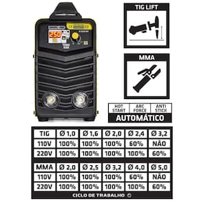 Kit Inversor De Solda 250a Mma Tig Lift Bivolt Ie-8250 TorkCaracterísticas:O inversor de solda IE-8250-BV Super Tork Profissional foi projetado com intuito de modernizar e facilitar os trabalhos de solda.Produto combinado 2X1 a fonte de solda tem a capacidade de realizar 2 processos de soldagem como TIG-LIFT e MMA.Com placa eletrônica construída em base SMD (montagem robótica) e inserção de componentes de alta qualidade a fonte de solda possui longa vida útil e baixo nível de manutenções.Com tecnologia IGBT aplicada em seu bloco de potência, a fonte de solda proporciona uma potente corrente de solda e baixo consumo de energia elétrica.Em sua construção eletrônica, dispositivos térmicos de proteção e cooler de alta capacidade de refrigeração aumentam seu ciclo de trabalho, segurança e produtividade em conjunto.Características especificas:- Reconhecimento automático de tensão;- Função MMA Eletrodo Revestido;- Função TIG-LIFT (Possibilita a solda de chapas finas e proporciona melhor acabamento) tocha não inclusa;- Solda todos os tipos de eletrodos, tais como: E6013, E7018, alumínio, inox e ferro fundido;- Alta capacidade de solda e ótimo ciclo de trabalho;- HOT-START MMA (Facilidade de abertura de arco elétrico com vários tipos e diâmetros de eletrodos);- ARC-FORCE MMA (Controle de estabilidade de arco inteligente, mantem o arco balanceado com corrente + tensão);- ANTI-STICKING MMA (Desabilita a corrente de solda quando eletrodo gruda, fácil remoção e segurança na solda);- Tecnologia IGBT, potente corrente de solda e baixo consumo de energia elétrica;- Indicador de proteção térmica (Segurança e inteligência);- Display Digital (Facilidade e precisão de ajuste);- Turbo ventilada (alta eficiência de refrigeração).CICLO DE TRABALHO MMA - ELETRODO REVESTIDOEletrodo 2,5mm - 100% EM 220V / 100% EM 127VEletrodo 3,2mm - 100% EM 220V / 100% EM 127VEletrodo 4,0mm - 100% EM 220V / 60% EM 127VEletrodo 5,0mm - 60% EM 220V / NÃO EM 127VCICLO DE TRABALHO TIG-LIFTTungstênio - 1.6 - 100% EM 220V / 100% EM 127VTungstênio - 2.0 - 100% EM 220V / 100% EM 127VTungstênio - 2.4 - 100% EM 220V / 80% EM 127VTungstênio - 3.2 - 80% EM 220V / 40% EM 127VEspecificações:- Marca: Super Tork- Modelo: IE-8250-BV- Voltagem: 127V e 220V (solda com bivolt automático)- Potencia: 8.500w- Frequência: 60hz- Tensão no Vazio: 73V- Corrente de entrada eficiente: 32A (127V) / 29A (220V)- Amperagem mínima: 20A- Amperagem máxima: 200A (127V) / 250A (220V)- Diâmetro do eletrodo: 2,0 ~ 5,0mm- Conector: 9mm- Ligação: Tomada (20A) ou Disjuntor- Hot Start: Automático- Arc Force: Automático- Anti Stick: Automático- Dimensões: 325 x 125 x 225mm- Peso: 4,200 kgItens que acompanham:- Porta eletrodo- Garra do terra- Escudo de proteção- Escova de limpeza• Garantia: até 2 anos ( 3 meses de garantia legal + 9 de meses garantia contratual + 12 meses de garantia adicional, para ter direito a garantia adicional, basta fazer o preenchimento do formulário no site oficial Super Tork)*IMAGENS MERAMENTES ILUSTRATIVAS*