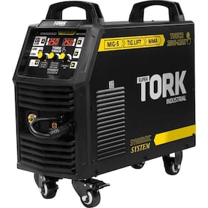 - marca: super tork - modelo: imets-9250-220v Ligação: disjuntor Frequência: 50/60hz Voltagem: 220v Corrente de entrada máxima mig: 38a Corrente de entrada eficiente mig: 29a Corrente de entrada máxima tig: 22.8a Corrente de entrada eficiente tig: 17a Corrente de entrada máxima mma: 36a Corrente de entrada eficiente mma: 27a Potência máxima: 8.360w Tensão no vazio: 60v Faixa de amperagem mig/mag: 50 250a Faixa de amperagem tig-lift: 20 200a Faixa de amperagem mma: 20 200a Capacidade do alimentador kg : 5kg e 20kg Consumível mma 2.5 3.2 4.0 5.0 Consumível mig 0.6 0.8 0.9 1.0 Consumível tig 2.0 2.4 3.2 4.0 Conector: 13mm + euro conector Dimensões: 308 x 585 x 510mm Peso: 26.000 kg