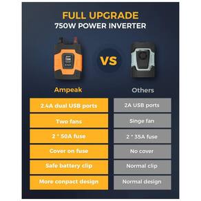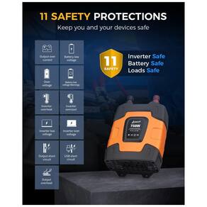 Inversor poderoso e prático Fornece 750 Watts DC contínuo para AC e 1500 Watts de capacidade de surto, com duas portas USB 3.1A e duas tomadas 110V AC para alimentar telefones celulares, laptops, luz de natal, câmera digital, ferramentas elétricas e outros dispositivos Proteção integral Fusível mini deslizante 35A substituível de 3 embutido, ventilador de resfriamento, alarme sonoro, proteção de desligamento automático contra sobretensão, baixa tensão, sobrecarga, curto circuito, superaquecimento Design amigável Ligue e desligue a qualquer momento de acordo com seu uso por um interruptor mecânico controlável. O status operacional é visível por indicadores LED. Alarme sonoro embutido irá informá lo se o inversor for operado de forma inadequada ABS Shell Vem com cabos alligator clip, que são mais s do que outros cabos de jacaré com cobertura de plástico. O revestimento de material ABS durável oferece proteção perfeita em todas as direções Marca: Não Informado