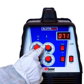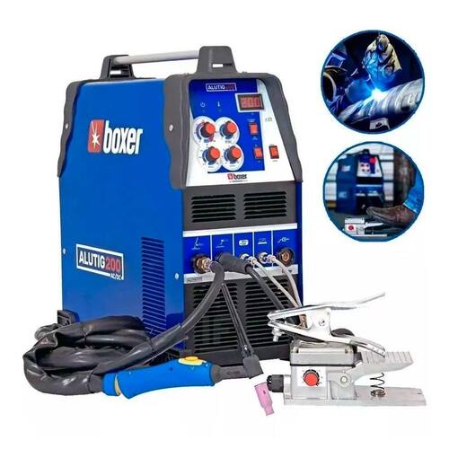 Inversora De Solda Para Soldar Alumínio Bivolt Alutig 200 Acdc Com Pedal E Tocha - Boxer Inversora De Solda Boxer Alutig 200 Ac/Dc 220v Máquina de Solda Marca: Boxer Modelo: ALUTIG 200 ACDC A máquina de solda ALUTIG 200 ACDC é perfeita para soldar alumínio com qualidade. Possui funções específicas para um soldador de alumínio profissional, porém tanto seu painel quanto os acessórios a tornam simples de se manusear até para um inexperiente. - Sua regulagem de amperagem pode ser feita através de um pedal que facilita a obtenção de um cordão de solda profissional. Com ele você muda intensidade do arco em tempo real, ou seja, durante o processo de soldagem - Solda chapas de até 1/4 6,35mm diretamente com excelente . Apesar de sua alta potência, também realiza soldas em chapas finas a partir de 0,7mm - Além de tudo serve como uma inversora. Com ela você pode inclusive soldar eletrodos para reparos e manutenções urgentes em campo Especificações Técnicas: Bivolt Ciclo de trabalho: 200A 60% Fator de potência: 0,73 Eficiência: 80% Frequência em TIG AC: 60Hz Balanço de onda em TIG AC: 20 80% Tempo pós gás: 2 8s Modo de abertura de arco: Alta frequência HF Espessura de chapa recomendada TIG: 0,5 6,5mm Grau de proteção: IP 21 Peso: 25,5kg Dimensões: 655 x 295 x 570mm Tensão de alimentação monofásica: 110V/220V Consumo máx : TIG: 34A e MMA: 53,4A Tensão em vazio: 56V Consumo máx : TIG: 10 140A e MMA: 30 135A 220V Tensão de alimentação monofásica: 220V Consumo máx : TIG: 26A e MMA: 39,5A Tensão em vazio: 56V Consumo máx : TIG: 10 200A e MMA: 30 185A Possui um painel simples, mas de regulagens precisas. É a única máquina TIG bivolt do mercado. Inteligente, reconhece automaticamente a voltagem. Acompanha o pedal para que o soldador faça o ajuste da soldagem em tempo real. Imagem Meramente Ilustrativa Marca: Não Informado