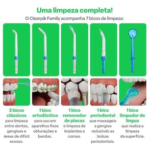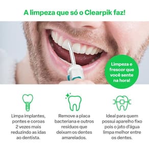 O Clearpik Family é mais eficaz, enquanto o fio dental limpa somente entre os dentes, o irrigador oral atinge áreas de difícil acesso como o fundo e céu da boca, debaixo da língua e gengiva através da limpeza em 360° garantindo assim uma higiene bucal muito mais completa.