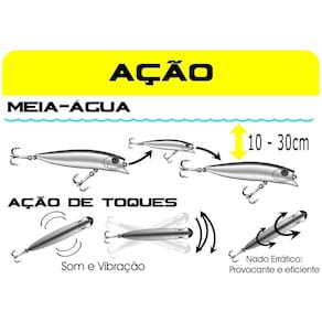 Isca Artificial Brava 7,7Cm Cor 24 Marine Sports A Isca artificial Brava 77 da Marine Sports não pode faltar em sua caixa de pesca, por sua eficiência e seu design o que ajuda na captura de predadores de diversas espécies, possui qualidade e eficiência excelente em quaisquer tipos de rios, desde os rios com água parada até os com correntezas, podendo ser Utilizado também em lagos, represas, pesqueiros, mares e outros. Durante o seu arremesso as de aço se desprendem de uma trava magnética deslocando-se para as extremidades da isca e assim tendo mais alcance e precisão em seu arremesso, quando a isca cai na água essas voltam a sua posição inicial garantindo um nado perfeito para atrair a presa. ESPECIFICAÇOES: Marca: Marine Sports Modelo: Brava 77 Tamanho: 7,7cm Peso: 7,2g Cor: 24 - Amarelo Ação: Meia-água Floating Com Rattlin Sistema XLC Xtreme Long Cast Marca: Não Informado Ean: 7898480957401