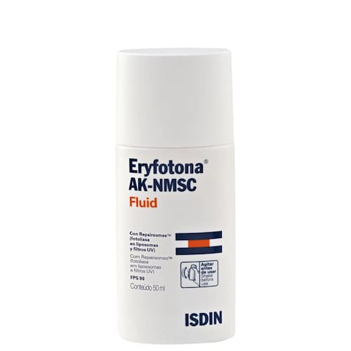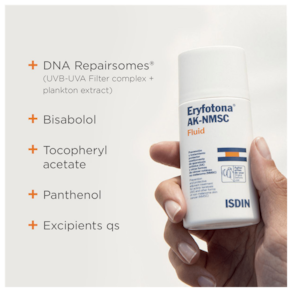 ISDIN Eryfotona AK-NMSC Fluid FPS 99 conta com a tecnologia DNA Repairsomes, composta por fotolíase encapsulada em lipossomas e filtros solares que previnem os danos causados ao DNA celular da pele pelos raios ultravioletas, como a queratose actínica (AK) ou o câncer de pele não melanoma (NMSC).