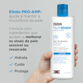O Gel de Banho ISDIN Nutratopic Pro-Amp mantém o pH da pele equilibrado, hidrata e restaura a barreira cutânea, aliviando a coceira provocada pelo ressecamento excessivo. Aumenta as defesas da pele e ajuda a inibir a adesão bacteriana, interrompendo o ciclo inflamatório.