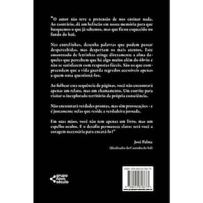 “O autor não teve a pretensão de nos ensinar nada. Ao contrário, dá um beliscão em nossa memória para buscarmos o que já sabemos, porém ficou abandonado no fundo do baú. Nas entrelinhas, desenha palavras que podem passar despercebidas, mas despertam os mais atentos. Este amontoado de letrinhas, atinge diretamente a alma daqueles que captam que há algo muito além do óbvio e não se satisfazem com respostas fáceis. Tem a compreensão que a vida guarda segredos que só aqueles que ousam questioná-los consegue alcançá-los. Ao folear esta sequência de páginas você não irá encontrar apenas um relato, mas sim um chamamento. Um convite para visitar o inexplorado território da própria consciência. Não irá descobrir verdades prontas, mas sim, provocações. E é justamente nelas que reside a verdadeira jornada. Em suas mãos você não terá apenas um livro, mas um espelho oculto. E o desafio resta claro: Você terá a coragem necessária para mirá-lo?” José Palma (Idealizador do Caminho do Sol) Destaques deste livro • Um livro que provoca reflexões profundas e desperta a consciência; • Palavras simples que escondem segredos para leitores atentos; • Fé e espiritualidade; • Conteúdo sensível (suicídio); • Mais do que páginas, um espelho oculto para olhar dentro de si; • Autoconhecimento, espiritualidade e novas perspectivas.; • Contem marca páginas junto;