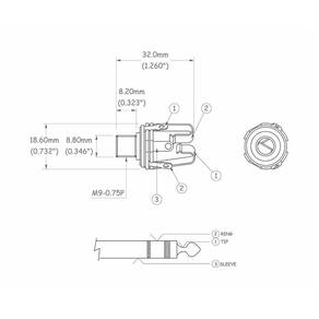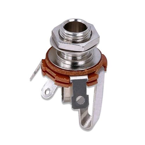- Jack de Conexão estéreo com rosca M9.5-0.8P - Aceita plugue padrão 1/4, para ligação estéreo ou para ativações eletrônicas - Acaompanha uma arruela e duas porcas.