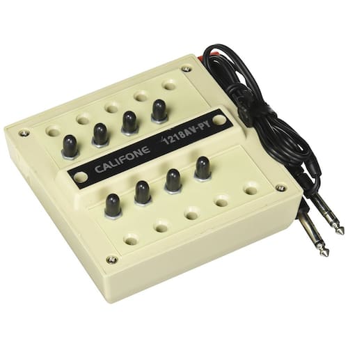 IMPORTANTE: Se for um produto elétrico, ele pode ser compatível com uma tomada de 110 volts. Se utilizado fora dos Estados Unidos, pode ser necessário um conversor de voltagem para garantir a operação adequada. Verifique se o produto que você está comprando é elétrico antes de considerar essas informações. O Jackbox Califone Mono de 8 posições com 8 controles de volume individuais é feito de uma caixa robusta de plástico ABS e contatos prateados e resistentes à umidade para evitar estalos. O Jackbox contém um cabo de 5 pés permanentemente conectado com telefone de 1/4 de polegada e miniplugues de 3,5 mm que se conectam a qualquer fonte de áudio.