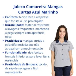 Adquira já seu jaleco camareira mangas curtas azul marinho e garanta conforto, durabilidade e uma aparência para o trabalho à sua equipe!