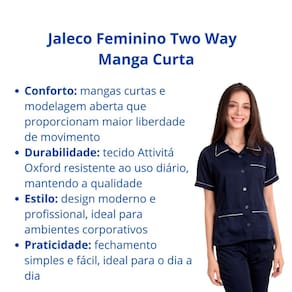 Jaleco Feminino Two Way Manga Curta Conforto e Estilo Profissional O jaleco feminino Two Way manga curta é uma excelente opção para quem busca conforto, praticidade e um toque de sofisticação no ambiente de trabalho. Com modelagem aberta e mangas curtas, este jaleco oferece liberdade de movimento, sendo ideal para profissionais que necessitam de um uniforme funcional e com ótimo caimento. Confeccionado no tecido Attivitá Oxford, garante resistência e durabilidade, além de um visual moderno e elegante.