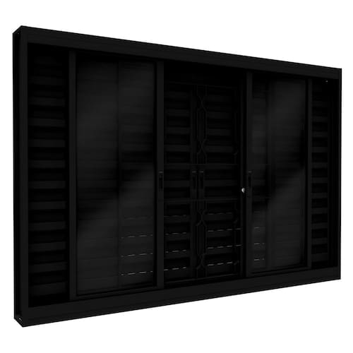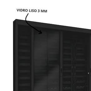 Com 6 folhas (2 fixas e 4 móveis), Seus vidros lisos são fixados com borracha EPDM, facilitando a troca em caso de necessidade.