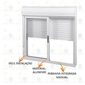 CARACTERÍSTICAS: Essa janela é de correr, com abertura para os lados direito e esquerdo. O material de sua composição é o alumínio pintado, em cor branca, e possui uma ótima resistência e durabilidade. Este modelo possui ainda persiana integrada manual e vidro transparente comum. Seu conforto térmico é médio e o acústico é alto. Não contém guarnição.