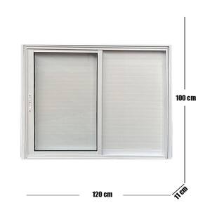 A janela do tipo de correr possui 3 folhas, sendo 2 folhas móveis, 1 veneziana e a outra de vidro e 3º folha veneziana fixa no lado direito. Feita com alumínio resistente aos mais diversos fatores e conta com pintura eletrostática branca.