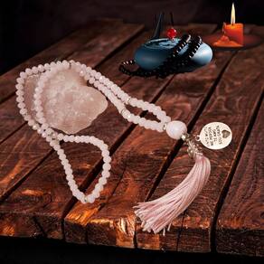 mas, também vem se popularizando no ocidente, e muito aqui pelo brasil e américa latina. É uma ferramenta que auxilia na concentração para a prática meditativa, repetição e contagem de mantras e orações, mantendo a mente focada e livre de pensamentos negativos. Controle do rítmo respiratório e cardíaco, e pressão arterial. As energias e vibrações positivas geradas na prática vão se imantando ao colar de contas a cada repetição, tornando-as cada vez mais poderosas. Poderoso aliado na busca do auto conhecimento, e colocando você mais alinhado com sua espiritualidade. Devido a sua beleza e valor estético cada vez mais vem sendo utilizado também como amuleto de proteção ou acessório no pescoço, enrolado no pulso, pendurado no retrovisor do carro. Confeccionados de forma personalizada com cristais carregados de energia e vibrações benéficos, além de muita beleza. Observações: