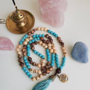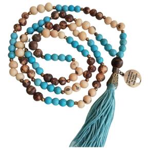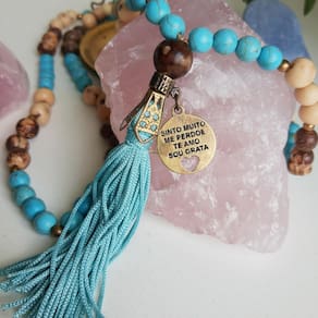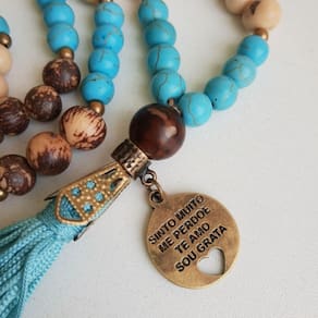 Japamala 108 contas em howlita turquesa e semente de açai japamala 108 contas em sementes de açaí e howlita turquesa, com pingente medalha do ho'oponopono. Pingente: medalhinha hoóponopono de metal na tonalidade ouro velho. sinto muito, me perdoe, te amo, sou grato número de contas: 108 comprimento incluindo tassel: aprox. 55cm