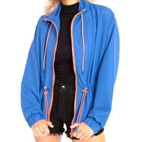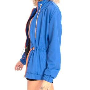 Jaqueta feminina confeccionada em tecido poliéster na cor royal com zíper laranja.