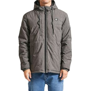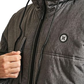 Jaqueta Hurley importada, tecido mescla (heather), capuz com cordão e gola alta, heat transfer layers frontal, bolso frontal com zíper, manga e barra com elástico, bolsos laterais e etiquetas personalizadas.