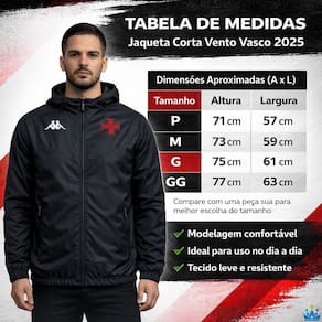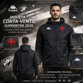 A Jaqueta Corta Vento Supporter 2025 do Vasco, produzida pela Kappa é a garantia de proteção, estilo e paixão pelo Gigante da Colina. Com escudo do Vasco e logo Kappa estampados, zíper frontal e capuz ajustável, é ideal para enfrentar o vento com orgulho e conforto.