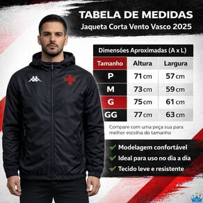 A Jaqueta Corta Vento Supporter 2025 do Vasco, produzida pela Kappa é a garantia de proteção, estilo e paixão pelo Gigante da Colina. Com escudo do Vasco e logo Kappa estampados, zíper frontal e capuz ajustável, é ideal para enfrentar o vento com orgulho e conforto.