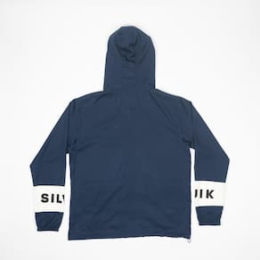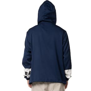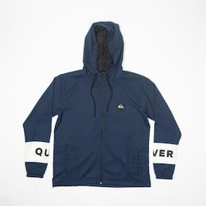 Jaqueta QuikSilver feita em modelagem regular, tecido de poliéster leve com forro de telinha no capuz, recorte contrastante nas mangas, silk uma cor localizado nos recortes das mangas, bolso simples nas laterais com forro de telinha interno, etiqueta personalizada aplicada no peito, barra com regulador de plástico, capuz com regulador de cordão e punho de elástico.