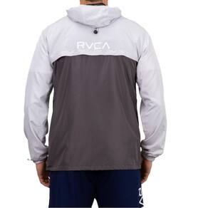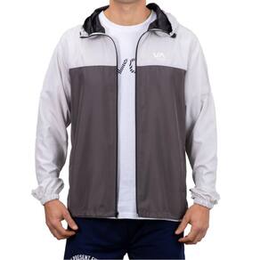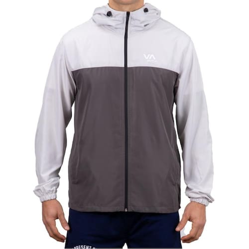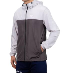 Jaqueta tecido de nylon leve da coleção RVCA SPORT, vista na frente com zíper, recortes no corpo com tecidos contrastantes, estampa silk localizado no peito, reguladores no capuz, bolsos na frente e etiquetas personalizadas.