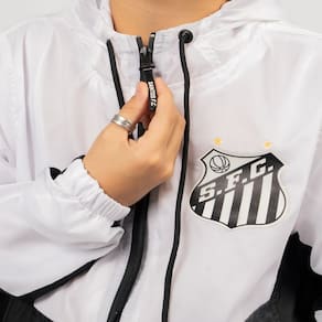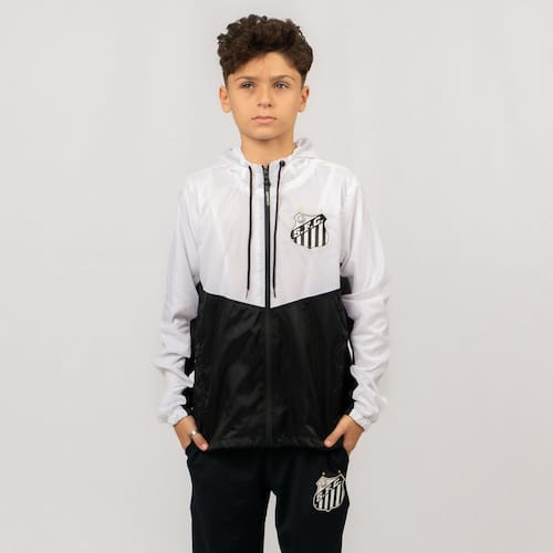 Compre agora a Jaqueta Corta Vento Nylon Juvenil Oficial Santos Branco Preto e mostre ao mundo o amor do seu filho pelo Santos!