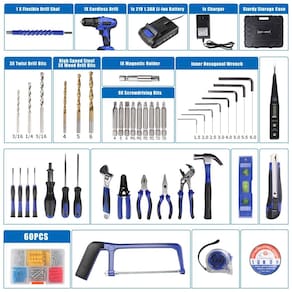 Conjunto de ferramentas com broca 107 peças Se você está procurando um kit de ferramentas com preço decente para sua casa, o kit de ferramentas Jar owl é uma boa compra. Este é um kit abrangente que vem com uma série de outras ferramentas, incluindo uma furadeira sem fio potente de 21v, chaves de fenda, alicates, chave de fenda de precisão com 4 bits, soquetes, fita métrica, nível de bolha e mais algumas coisas. Você obterá uma ótima caixa de ferramentas pelo preço favorável. Todo o motor de cobre, furadeira sem fio de 21V com LED A furadeira de martelo sem fio ajustável de 21V de 18 1 velocidade pode perfurar madeira, metal, plástico, etc. Kit de ferramentas manuais para reparo doméstico Este conjunto de ferramentas é perfeito para artesanato e tarefas em seu apartamento. Tem todas as ferramentas que você precisa para instalar móveis s ou para perfurar e pendurar coisas pela casa. Grande variedade de ferramentas e suprimentos, perfeito para conjunto inicial. As ferramentas são fabricadas em liga de aço, cromadas para resistir à corrosão, com punhos antiderrapantes e confortáveis Marca: Não Informado