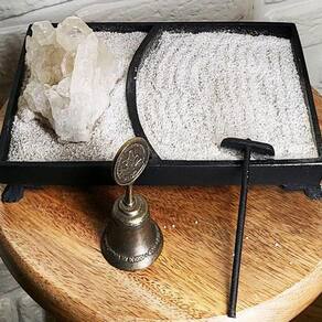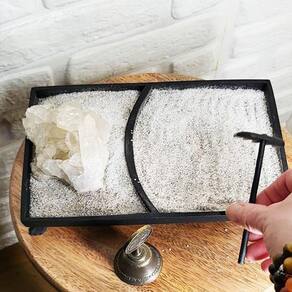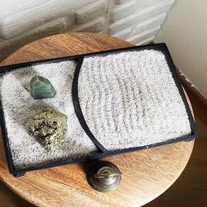 Na areia do Jardim Zen é conveniente desenhar pequenas ondulações, para representar o movimento do mar e dar mais vida ao espaço. Por se tratar de um espaço em que você vai criar uma energia, você pode colocar aquilo que você deseja despertar pra você e o seu ambiente.A dica é optar pelas mini imagens, cristais e pedras naturais. Alem de decorativo e prático, e facil combinar bem com os demais elementos da sua casa.