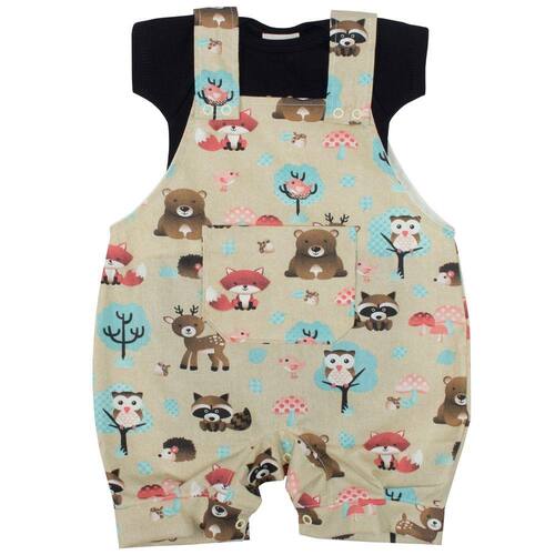 Jardineira de Bebê Floresta 2 Peças sendo uma jardineira na cor bege com detalhes de bichinhos na floresta e camiseta preta. Roupa para o baby super soltinhas e a cara do verão. A camiseta é básica e com mangas curtas; E a jardineira possui fechamento com botões de pressão (nas alças e entrepernas)