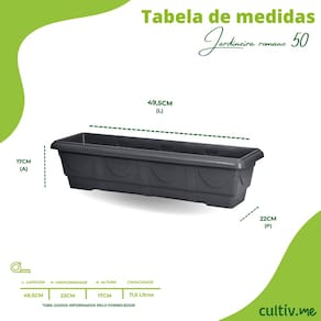 Jardineira Romano 50 (11,5L) Cor Preto NUTRIPLAN Descrição * A Linha Jardins é inspirada nos monumentos da Roma Antiga. * Com um design clássico e linhas que expressam dimensões monumentais, este produto é leve, estável e prático. * A linha Jardins foi criada especialmente pra quem ama cultivar. * Cores e formatos que encantam os hobistas e cultivadores dos mais diversos tipos de plantas. * Design exclusivo. * Produto resistente e possui proteção UV. Características * Tamanho: N-50 * Altura: 17 cm * Comprimento: 49,5 cm * Largura: 22 cm * Capacidade: 11,5 Litros * Cor: Preto* Formato: Retangular * Material: Plástico PP Injetado Informações/Dicas/Usos * PRATO vendido SEPARADAMENTE. * SUPORTE vendido SEPARADAMENTE. Nós da CULTIV.ME trabalhamos desde 2013 para trazer os melhores produtos ao alcance de todos CULTIV.ME o verde que faltava!