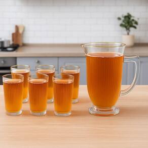 O conjunto Lila da Hauskraft é a escolha ideal para quem deseja servir bebidas com sofisticação e estilo. Composto por 1 jarra de 1 litro e 6 copos de 265 ml, todos em vidro texturizado de alta qualidade, o kit une beleza, resistência e funcionalidade em um único produto.