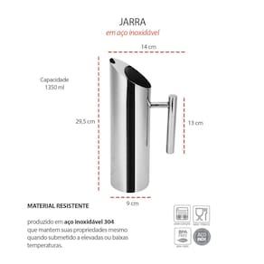 1 Jarra Capacidade: 1350 ml Medidas: 29,5 x 14 cm Material: Aço inoxidavel 304 Peso: 480g Marca: CASACHA