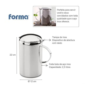 Materiais:: Inox | Comprimento (em cm):: 17 | Largura (em cm):: 12 | Altura (em cm):: 22 | Diametro (em cm):: 0 | Peso liquido (em gr):: 525 | Capacidade (em gr):: 0 | Capacidade (em ml):: 2300 | Comprimento da emb. (em cm):: 16,5 | Largura da emb. (em cm):: 15 | Altura da emb. (em cm):: 23,5 | Peso bruto (em gr):: 640
