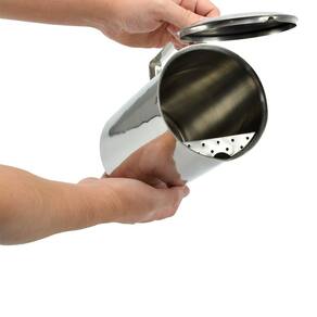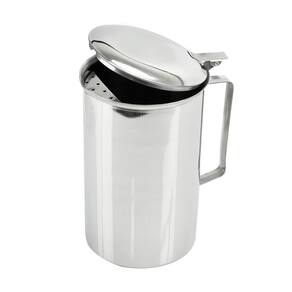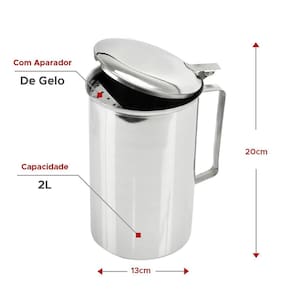 Jarra De Suco Inox 2l Tampa e Aparador De Gelo Água Refresco Essa Jarra Inox possui capacidade para 2 litros, ela é muito versátil pode ser usada tanto para uso residencial como profissional em restaurantes buffet e hotéis, para evitar respingos ela possui um aparador de gelo fico na ponta e tampa que evita que caia partículas ou mosquitos na bebida e por falar em bebidas ela pode ser usada tanto como jarra para suco, chá, cerveja ou água.