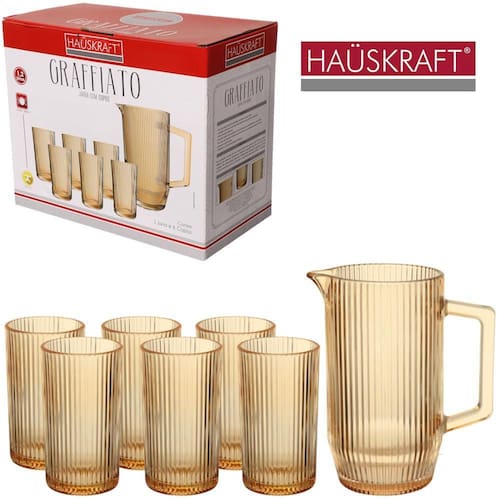 Jarra de vidro graffiato ambar 1,2l com 6 copos 420ml Informações do Produto Conjunto Jarra com 6 Copos Graffiato Âmbar Hauskraft