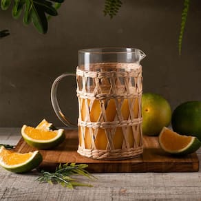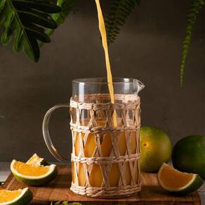 A jarra de vidro 1 litro combina elegância atemporal com um toque de rusticidade, oferecendo uma maneira encantadora de servir água, suco, drinks e outras bebidas refrescantes. Com um design decorado de fibra natural e uma capacidade de 1 litro, esta jarra pequena é perfeita para ocasiões formais e informais. A alça ergonômica proporciona facilidade no manuseio, enquanto o vidro de alta qualidade garante durabilidade e transparência cristalina. Além de água e sucos, esta jarra é adequada para servir uma variedade de bebidas, incluindo limonada, chá gelado, sangria e coquetéis, tornando-a uma peça versátil para diversas ocasiões.