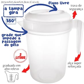 Conjunto com 6 jarras. Jarra plástica reforçada com capacidade para 2 litros. Possui tampa e graduação para medida. Sua tampa tem duas formas de abertura: de um lado o fluxo de líquido é contínuo e o outro possui coador para gelo e pedaços de fruta. É produzida em material atóxico, livre de BPA e pode ser usada no freezer e no micro-ondas.Material: polipropilenoCapacidade: 2 litrosComprimento: 20,0 cm / Largura: 15,6 cm / Altura: 22,0 cm
