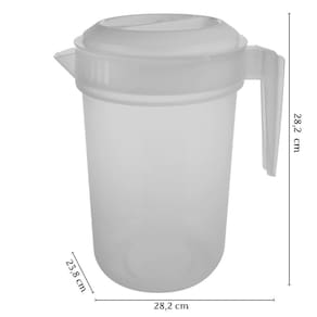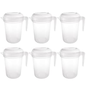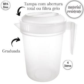 Conjunto com 6 jarras. Jarra plástica reforçada com capacidade para 4 litros. Possui tampa e graduação para medida. Sua tampa tem duas formas de abertura: de um lado o fluxo de líquido é contínuo e o outro possui coador para gelo e pedaços de fruta. É produzida em material atóxico, livre de BPA e pode ser usada no freezer e no microondas.Material: polipropilenoCapacidade: 4 litrosComprimento: 23,8 cm / Largura: 19,4 cm / Altura: 28,2 cm