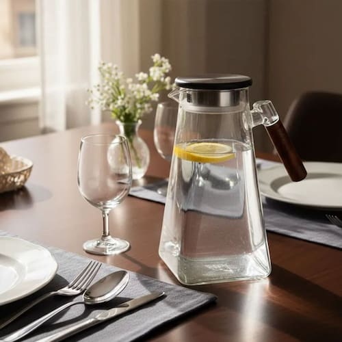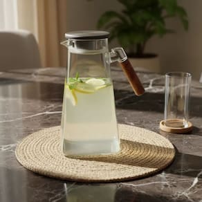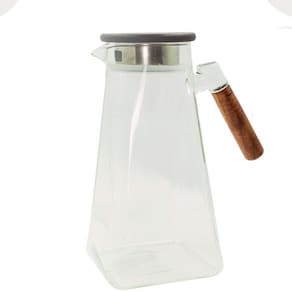 Elegancia e Estilo nesta Jarra com Tampa de Metal e Madeira e Alça de Madeira.Base Quadrada e Vidro liso dão Originalidade e Beleza