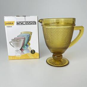 Adquira agora a Jarra Vidro Com Alça Amarelo Âmbar Relevos Bolinhas 1L150Ml e transforme a sua mesa em um verdadeiro cenário de encanto. Marca: In Casa Ean: 7898512879428