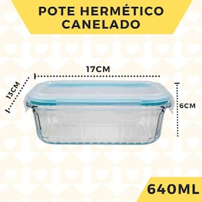 POTE DE VIDRO HERMÉTICO CANELADO – 640ML Os potes herméticos canelado são perfeitos para o dia a dia e ideal para conservar comidas em diferentes temperaturas, podendo ir à geladeira e/ou freezer. Eles garantem o melhor sabor, não fica com cheiro indesejado e você pode esquentar no micro-ondas ou no forno, nesses casos tire a tampa. Ideal também para quem trabalha e leva o alimento de casa, o pote possui vedação com tampa hermética, antivazamento, garante que os alimentos sejam bem conservados e o vidro super-resistente. CONTEÚDO DA EMBALAGEM