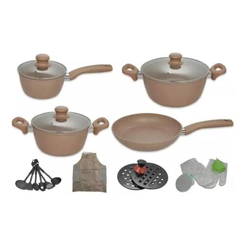 Jg de panela quartzo stone marrom gold antiaderente Melhore a sua cozinha com a coleção dsseldorf quartzo stone creme com qualidade , projetada para um ótimo desempenho de cozimento em casa. Conteúdo: 18 peças As tampas são contadas como peças. Conjunto de panelas: 1 caçarola 20cm 1 caçarola 16cm 1 frigideira 20cm 1 panela 28cm Utensílios: 6 utensílios de cozinha em silicone preto 1 avental 2 luvas 1 pegador 1 bucha 2 botões de sucção 2 suportes para panelas. : 90 dias. Marca: Não Informado Ean: 7802146601126