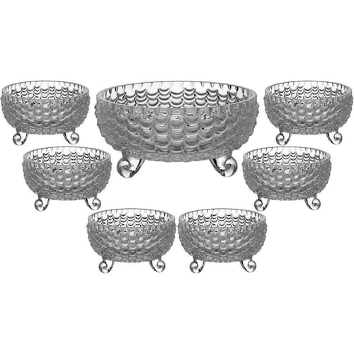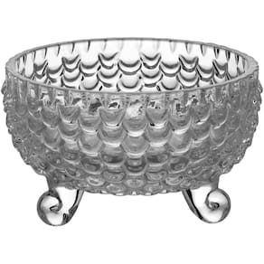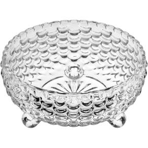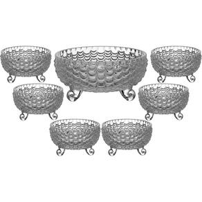 Esse lindo jogo de sobremesa é confeccionado em vidro transparente de alta qualidade. Possui um visual elegante e altos-relevos em sua superfície. A base possui três pés de vidro muito bem moldados que dão um charme a mais às peças.