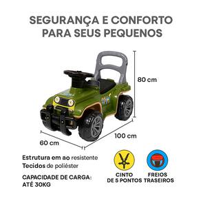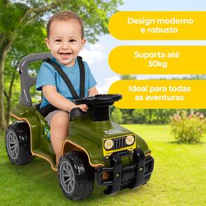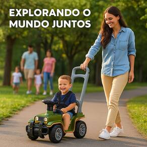Jip Jip Militar é dois em um e acompanha o crescimento da criança.Quando se retira o anel de proteção, apoio de pés e guia, a criança pode brincar sozinha.A haste que guia o carrinho vira as rodas e é fácil de remover, tem grip de toque seguro e vem com gancho para pendurar bolsa. O anel de proteção levanta para facilitar o acesso à criança. A chave gira, o câmbio faz creck creck e a buzina tem som divertido. oooo