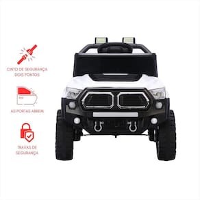 Jipe - black hawk x 12v - branco Aventura sobre rodas para os pequenos pilotos Este jipe elétrico infantil combina robustez, design moderno e tecnologia para proporcionar momentos inesquecíveis de diversão. Ideal para crianças de até 30 kg, ele é perfeito para brincadeiras ao ar livre, com um visual off-road que conquista à primeira vista. Com um visual inspirado em jipes 4x4, este veículo infantil conta com detalhes imponentes como faróis de led, para-choque robusto e pintura estilizada. Um brinquedo que chama atenção pela aparência e acabamento. Equipado com duas baterias de 6v, o jipe garante mais tempo de diversão e energia para explorar diversos terrenos. Acompanha carregador bivolt, facilitando o recarregamento em qualquer tomada. Perfeito para estimular o desenvolvimento motor, a imaginação e o senso de direção dos pequenos, este jipe é um presente inesquecível.