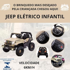 O Jeep possui luzes em led, cinto de segurança, volante com direção hidráulica, pedal de aceleração, controle remoto e painel digital multimídia, com entrada para usb e aux.