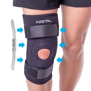 Joelheira Articulado Ajustavel Plus Size DESCRIÇÃO A Joelheira Articulada Ajustável Plus Kestal possui articulações metálicas laterais com trava, que estabilizam o joelho, impedem a sua hiperextensão e evitam a laterização dos movimentos. A compressão é reforçada pelas duas faixas inferior e superior que se prendem no fecho aderente proporcionando assim mais firmeza e segurança.